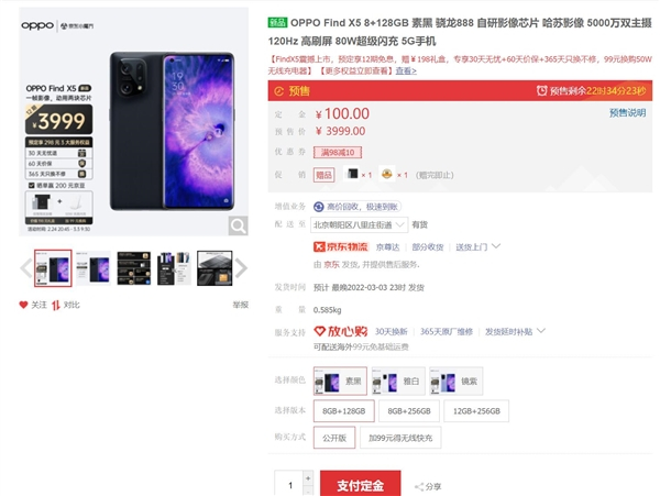 今天,OPPO京东自营旗舰店显示,OPPO Find X5将于明天正式首销,首发起售价为3999元(8GB+128GB),有素黑、雅白、镜紫三种颜色可选。