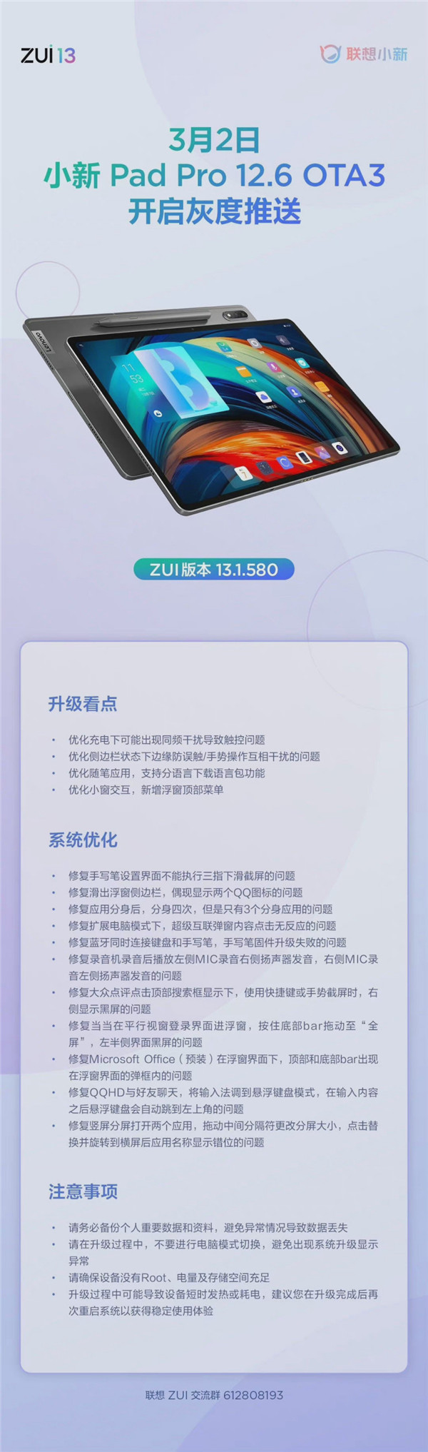 3 月 2 日消息,联想小新 Pad Pro 12.6 于去年 11 月发布,搭载骁龙 870 芯片,配备 8GB 内存与 256GB 存储,首发价 3699 元。今日,ZUI 官方宣布,小新 Pad Pro 12.6 OTA ZUI 13 开启灰度推送。
