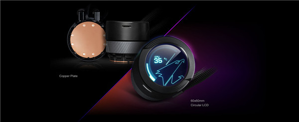 水雕 PRO 240 水冷头部分采用铜片覆盖,可以更加高效的传导处理器产生的热量。搭载的圆形液晶显示屏,可以通过 RGB Fusion 2.0 软件实现不同效果的切换,可展示处理器温度、水冷泵转速等信息,这块圆形屏幕还支持自定义文字、视频、图片功能,高度个性化给了玩家更自由的装饰空间。为了方便不同角度展示,水雕 PRO 240 屏幕还支持 330 度手动旋转设计,可自由调整自己喜爱的角度。