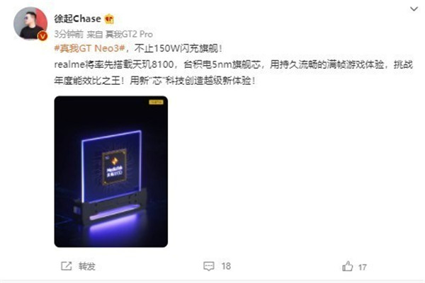 在微博原文中徐起表示,真我GT Neo3除了首发搭载150W神仙快充外,率先搭载的这颗天玑8100 5G旗舰芯片也能用持久流畅的满帧游戏体验挑战年度能效比之王,创造越级新体验。