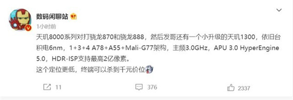 根据数码闲聊站的爆料,联发科除了天玑8000、天玑8100和天玑9000之外,还有一款天玑1300,是天玑1200的升级版。