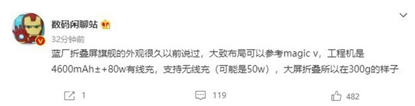 该博主曾曝光过X Fold的配置,其采用5000万像素1/1.3"主摄+4800万像素镜头+1200万像素 2X+800万像素 5X的后摄模组,采用QHD+2K内屏以及FHD+2K外屏,同时保证了单双手的用机体验。