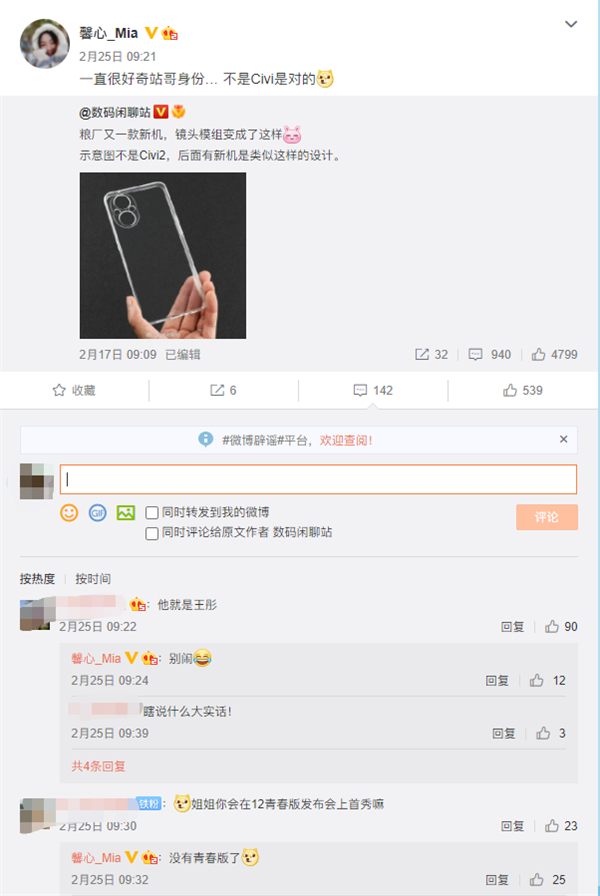 此前曾多次有该机的相关爆料出现,不过近日却被小米Civi的新任产品经理@馨心_Mia 明确否定,称“没有青春版了”。