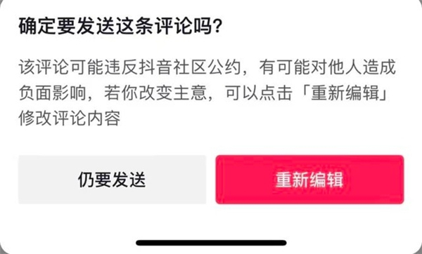 其中,针对评论的“发文警示”功能会引导用户友善评论。该功能下,若系统模型判定已经发送的评论存在问题,则会推送弹窗提醒,建议发送者重新编辑,去除不当言论。