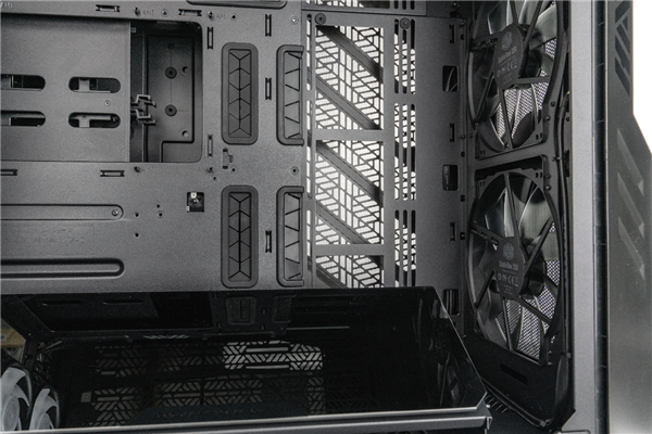 HAF 700 EVO前置标配专门打造的两个200mm SickleFlow高性能版风扇,不仅风量更大,噪音控制也非常到位,尾部则标配两个120mm SickleFlow风扇将热量排出,底部还有一个120mm SickleFlow进行辅助进风,整机支持多达18个120mm风扇安装。