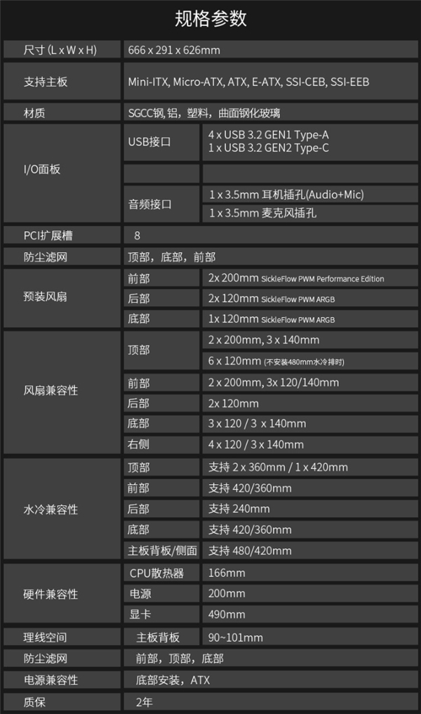 机箱整体尺寸666×626×291毫米,因此内部拥有超大的空间,可以安装包括SSI-EEB 355×355毫米在内的所有规格主板,背面免工具电源仓最长支持200毫米,显卡长度最大490毫米,其实等于没有任何限制。