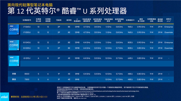 英特尔 Alder Lake-U 低压版系列针对超薄办公本和超薄游戏本,共有14款,除酷睿外,还有奔腾和赛扬系列,其中U系列有15W和9W功耗两个不同阵营,9W版本封装更紧凑,扩展支持略有不同,具体规格如下: