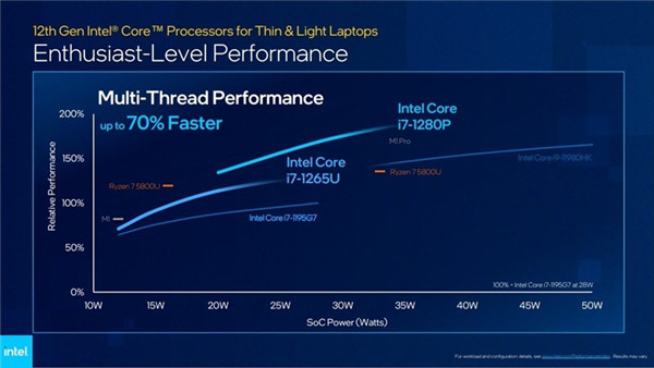 至于性能,官方宣称比上代的多线程性能最多提升70%,3D渲染提升了接近两倍,而照片编辑速度提升最高也有30%,生产力较上一代产品来说有了相当大的提升。以Core i7-1195G7在28W时的性能表现为100%的参照点,这代的Core i7-1265U大约用了17或18W的功耗就能提供相近的性能,而Core i7-1280P在同样的功耗下性能提升了相当多。