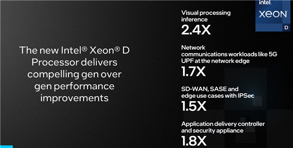 至强D-1700及D-2700系列处理器工艺及架构双双升级,所以性能相比之前的至强D提升明显,视觉处理器性能2.4倍,5G UPF之类的网络通信负载1.7倍等等。