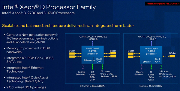 出了性能大幅升级,至强D-1700及D-2700系列的扩展性也全面提升,支持3/4通道DDR4内存,支持384GB/1TB最高内存容量,最多32条PCIe 4.0通道,还有24个SATA,支持100Gbe(10万兆)以太网。