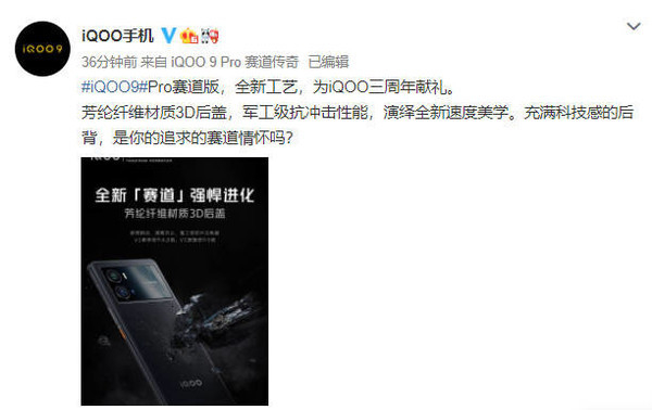 2022年1月初,iQOO 9系列旗舰级新机正式发布,iQOO 9 Pro传奇版、燃擎两款配色凭借着“速度美学”的设计俘获了不少消费者芳心。2月24日,iQOO官方再次遵循“速度美学”的设计语言,宣布为iQOO 9 Pro推出全新“赛道版”配色,为iQOO三周年献礼,并采用了全新工艺,将芳纶纤维运用到手机上,将疾速的性能与赛车的视觉体验相结合。