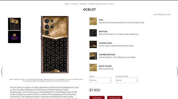 2月23日消息,据GSMArena报道,知名奢侈品公司Caviar带来了奢华定制版三星Galaxy S22 Ultra,限量99台。