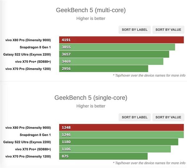 目前有许多手机厂商都已经发布了上半年的旗舰手机,不过这些手机都清一色采用了骁龙8 Gen 1处理器,相信看了几家手机的性能测试之后,大家对于骁龙8 Gen 1的性能有着初步的了解。而除了骁龙8 Gen 1之外,联发科天玑9000处理器的推出也受到了大家的追捧,原因是在之前的工程机之中,天玑9000处理器给人的印象相当地不错,特别是其出色的能效比。而现在网上也出现越来越多搭载天玑9000处理器的手机,例如vivo X80系列手机,昨天在公布了安兔兔跑分之后,今天这款手机又公布了GeekBench 5的跑分,大家可以看看在量产机下天玑9000处理器的表现。