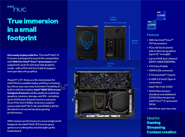 至于大家最为关心的显卡插槽,这款NUC可以支持双插槽显卡,而且显卡长度最高为30.5cm,并且英特尔还表示即使是面向下一代的PCIe 5.0显卡同样可以支持,应该40系显卡是不用担心了。不过英特尔给的主板仅支持DDR4而不是DDR5,是不是英特尔觉得DDR5的价格还是太高了点?