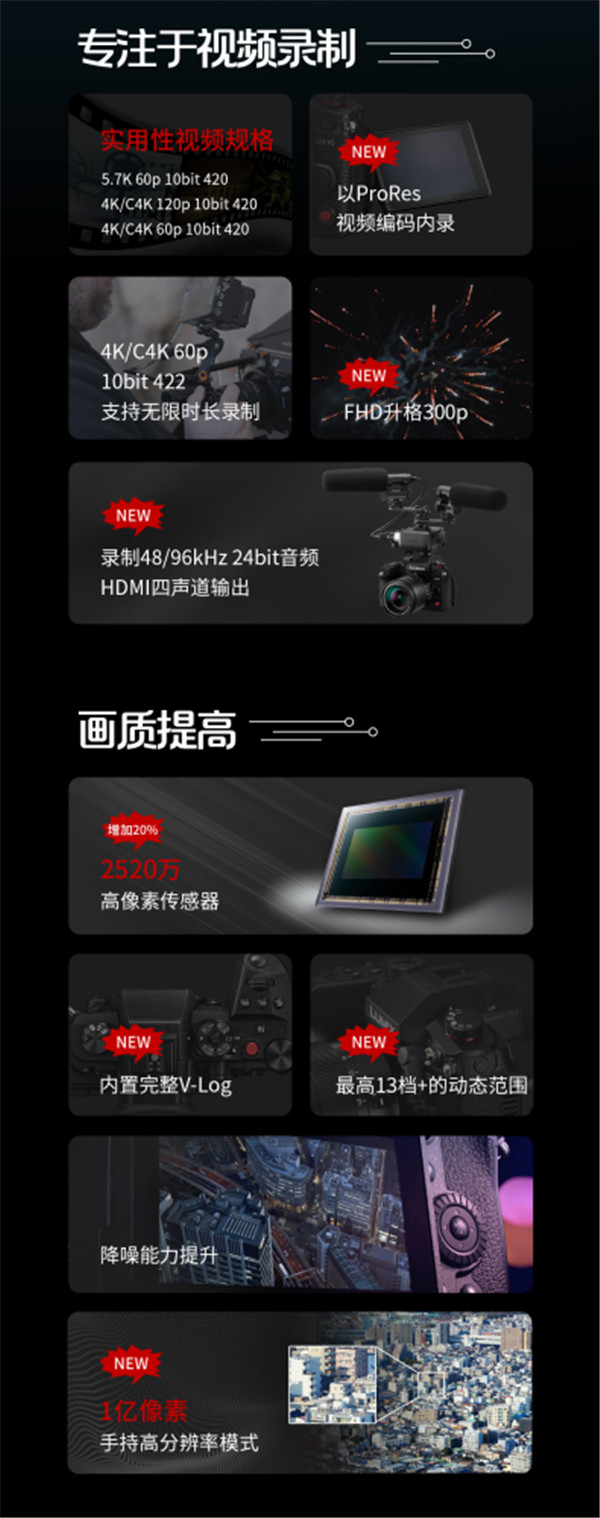 LUMIX GH6 采用 Live MOS 传感器,有效像素数在上代基础上增加 20% 以上,达到了 2520 万像素,实现了高分辨率、高速读取和高动态范围。新维纳斯引擎还在图像处理技术上进行了升级,以重现自然的细节和丰富色彩的高分辨率图像,这也是松下相机的标志性特点。