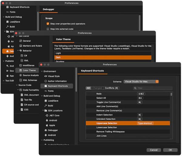 微软还完成了将 IDE 的主线功能迁移到原生 macOS UI 的工作。在这个版本中,迁移到原生 macOS UI 的 UI 包括扩展管理器、更改签名快速操作对话框、Git Stash 对话框和 Rebase 对话框,以及偏好屏幕 —— 颜色和字体、键盘快捷键、调试器设置。微软还将在下一个预览版中移植其余的首选项屏幕。