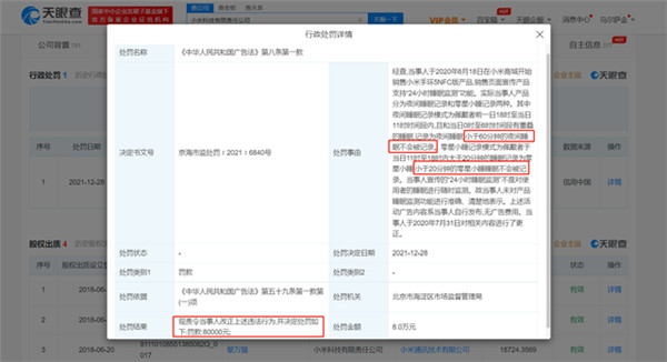 2 月 21 日消息,信息显示,近期,小米科技有限责任公司因产品功能表述不准确,违反广告法,被北京市海淀区市场监督管理局罚款 8 万元。