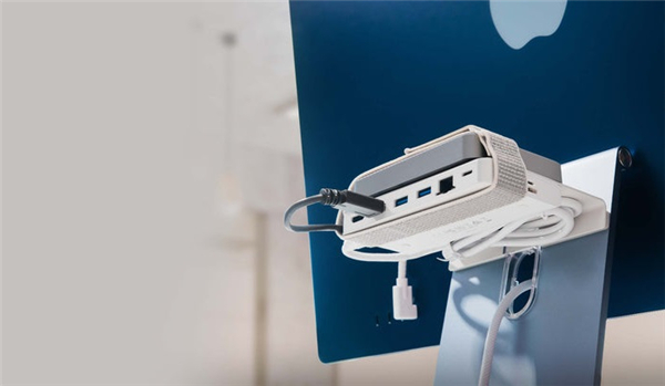 先是将固定件卡入 iMac 支架背面的椭圆形理线孔,然后将 BackPack 主体滑靠到上方,以提供数英寸的置物空间。