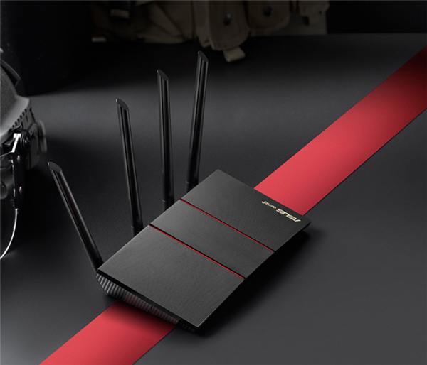 设计方面,华硕RT-AX56U热血版采用黑红电竞风格,上升型机身,两道红色印记点缀,配备四根有力的冲冠天线,姿态挺拔。
