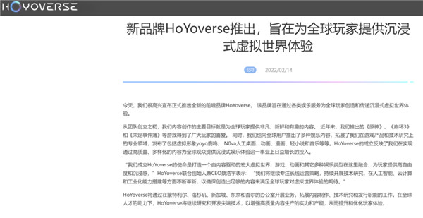 2 月 14 日消息,据 HoYoverse 官网,今日,米哈游(MiHoYo)宣布正式推出全新前瞻品牌 HoYoverse,该品牌旨在通过各类娱乐服务为全球玩家创造和传递沉浸式虚拟世界体验。