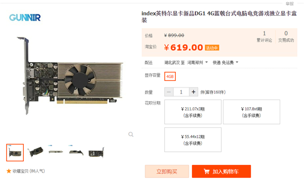 日前这款Intel DG1 MAX显卡已经开卖,并且登陆了淘宝商城,共有两家商家在出售,价格为619元。