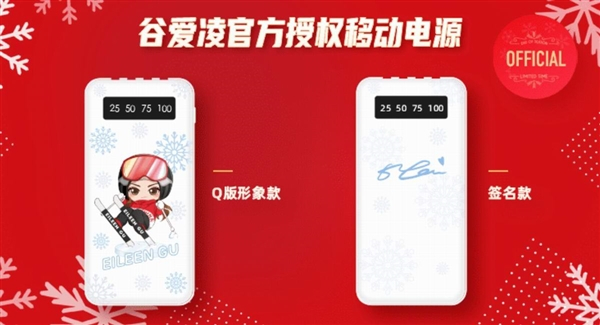 移动电源采用白色壳体,上面印有谷爱凌滑雪Q版形象,另有签名款可选,三维尺寸141mm X 69mm X 18mm,重量230g,内置电池容量为10000mAh,输出功率为5V/2.1A,输入功率为5V/2A。