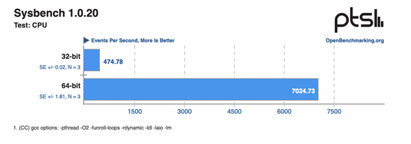 详细的测试结果不一一列举了,感兴趣的可以参考原文,简单来说就是升级到64位系统之后,树莓派性能提升明显,提升较少的也有10%以上,超过100%性能提升的也不在少数,而在Sysbench 测试——这是一个测试CPU和内存的多线程基准工具,️64位处理器+64位操作系统的优势被最大化,64位的性能提升幅度达到了惊人的 1380%,也就是14倍的性能差距,非常明显。