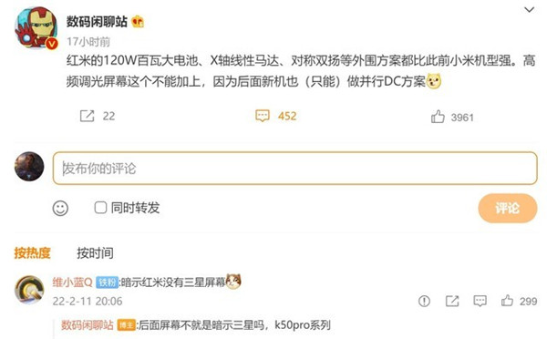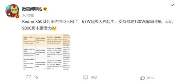 值得注意的是该博主之前还表示,Redmi K50系列正代机型入网了,67W超级闪充起步,支持最高120W超级闪充,天玑9000版本赢很大。
