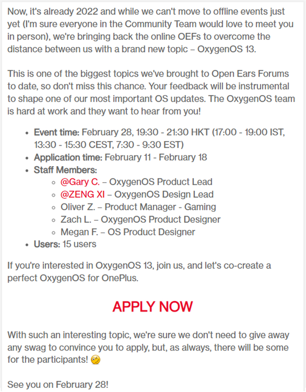 届时可通过提交 Email ID / OnePlus 社区用户名加入 OEF,且用户会被问到是否愿意签署保密协议。
