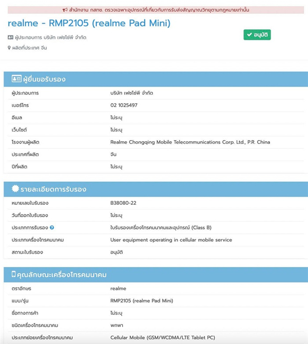 NBTC 认证信息表明,Realme Pad Mini 支持 4G LTE 蜂窝移动网络,而 BIS 认证信息表明该平板将很快登陆印度市场。