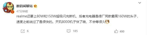 今日,数码博主@数码闲聊站爆料,realme还要上80W和150W超级闪充新机,后者充电器是绿厂同款最高160W的头子,速度之前说过了是很快的。