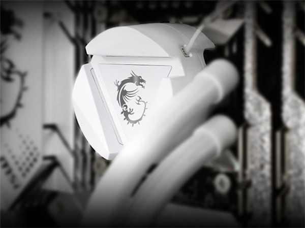 白色装甲覆盖了水冷块、管道的尼龙套管、风扇框架和散热器。CoreLiquid-R 的一个特点是泵与散热器的集成,而不是水冷块,它相对较轻。水冷头的 ARGB 照明顶部可旋转,可以重新定位 MSI 游戏徽标。