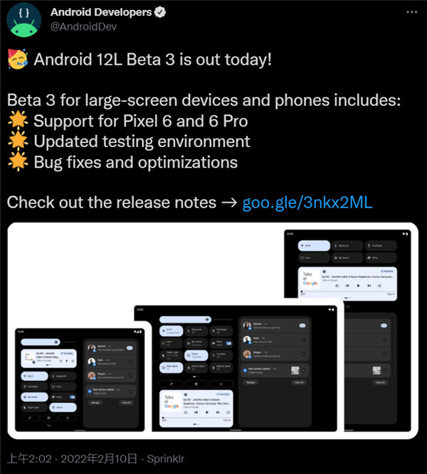 谷歌今日宣布,Android 12L Beta 3 版本发布,首次支持了 Pixel 6 和 Pixel 6 Pro,以及更新的测试环境、缺陷修复和优化。