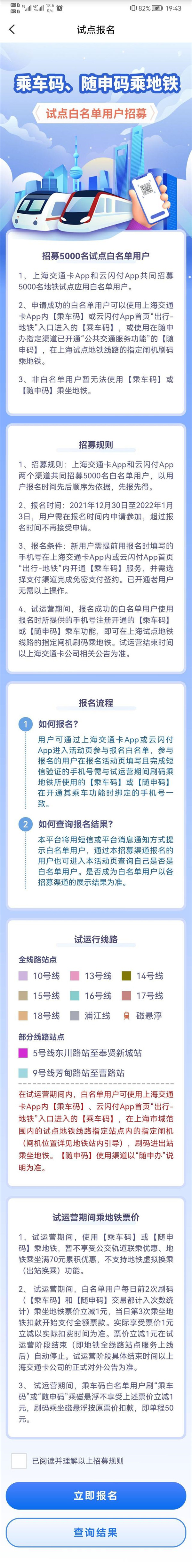上海交通卡 App 和云闪付 App 共同招募 5000 名地铁试点应用白名单用户。申请成功的白名单用户可以使用上海交通 卡 App 内 [乘车码] 或云闪付 App 首页“出行- 地铁”入口进入的 [乘车码],或使用在随申办指定渠道已开通“公共交通服务功能”的 [随 申码],在上海试点地铁线路的指定闸机刷码乘地铁。非白名单用户暂无法使用 [乘车码] 或 [随申码] 乘坐地铁。