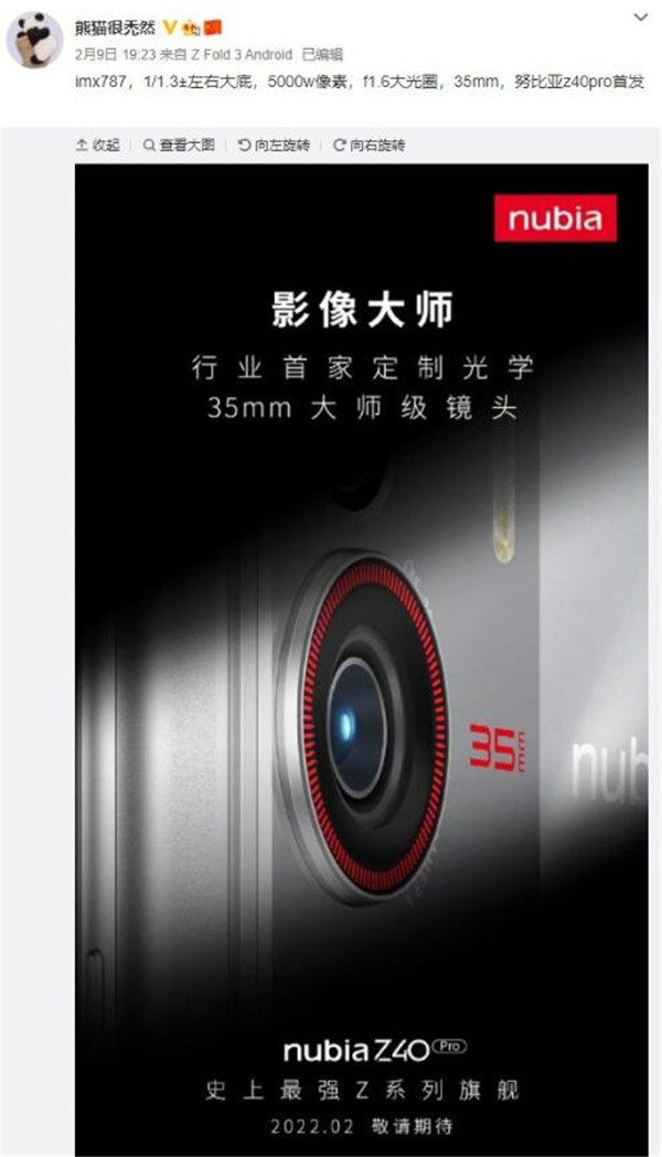 据消息显示,数码博主@熊猫很禿然曝光了努比亚Z40 Pro的摄像规格。其称这款手机将全球首发索尼IMX787旗舰传感器,拥有1/1.3±英寸大底、5000万像素和F1.6大光圈,还具有行业首家定制35mm大师焦段。此外,官方也曾发布博文为该机预热,称这款手机搭载35mm大师镜头,能让畸变降低35%、进光量和清晰度分别提升80%和78%。