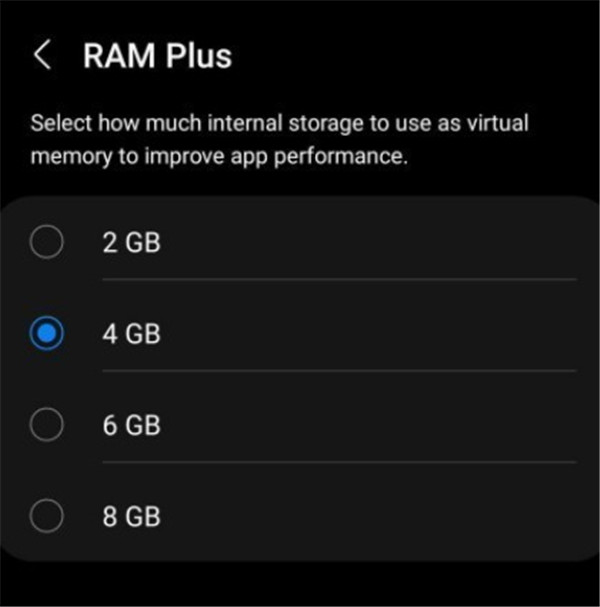通过RAM Plus虚拟内存技术,用户可以获得最大8GB的虚拟内存,同时可根据自己的需求选择2GB、4GB、6GB以及8GB等不同的选项。