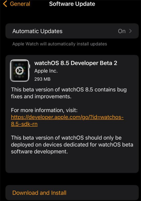 要安装 watchOS 8.5,开发者需要从苹果开发者中心下载配置文件。安装后,可以通过 iPhone 上的专用 Apple Watch 应用程序,进入通用 > 软件更新,下载 watchOS 8.5。