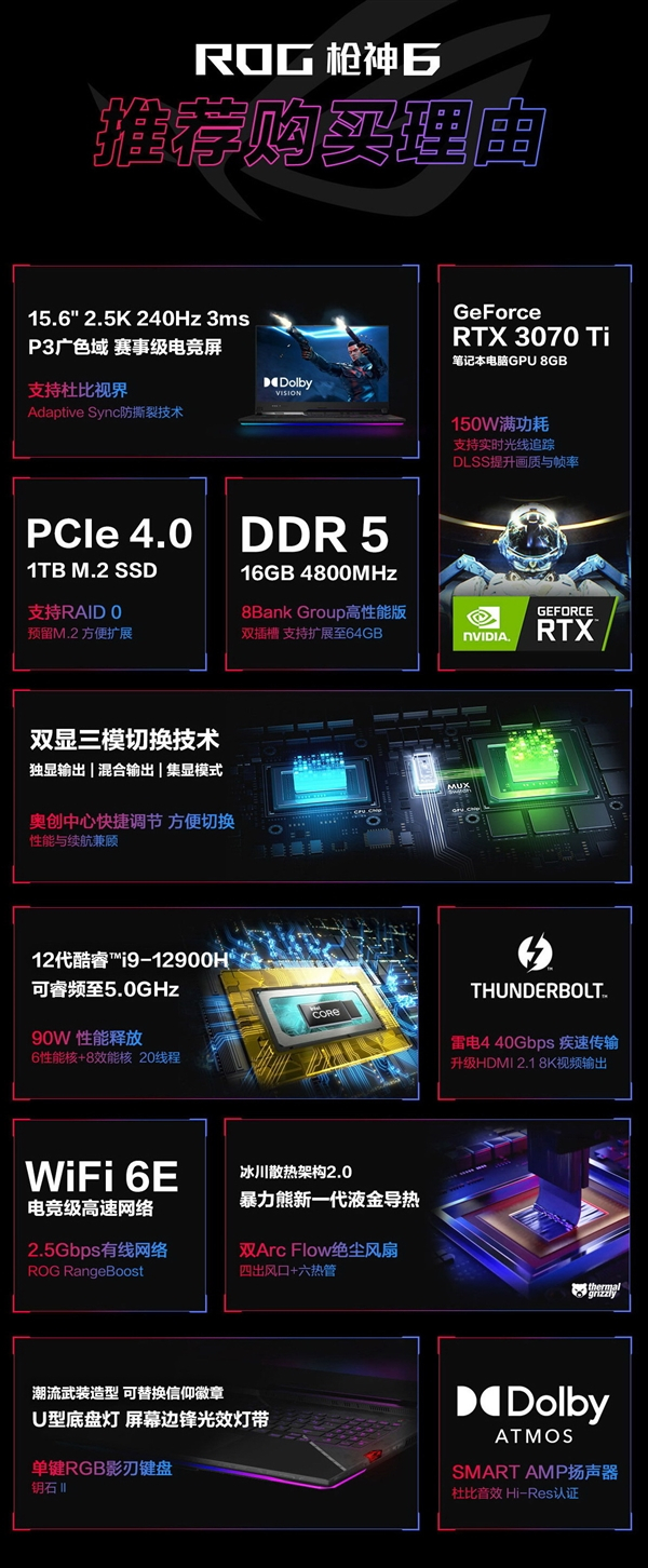 屏幕方面,ROG枪神6配备了一块15.6英寸的赛事级电竞屏(ROG枪神6 Plus 17.3英寸),2560×1440分辨率,240Hz高刷(自动调节),3ms疾速响应,100% P3色域,支持杜比视界、Adaptive Sync防撕裂,都是针对游戏优化。