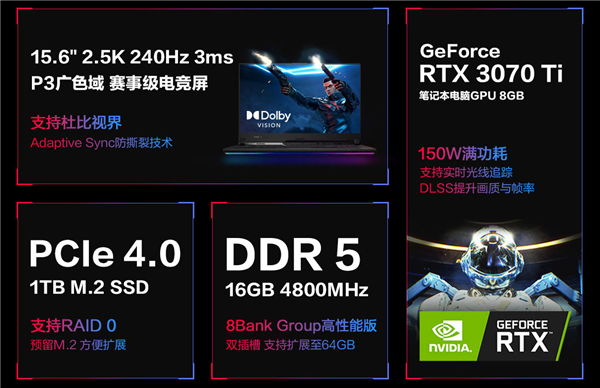 显卡配置NVIDIA GeForce RTX 3070 Ti笔记本电脑GPU,拥有150W满功耗释放,更支持ROG全新双显三模技术,可开启独显输出模式进一步释放GPU性能,配合16GB DDR5-4800 MHz 8BG高频内存与1TB PCIe 4.0固态硬盘,2022 3A游戏新作轻松玩转。