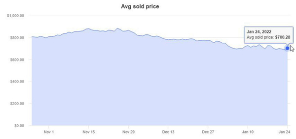 在游戏主机方面,PS5 和 Xbox Series X 的 eBay 二手价格也在下降,The Verge 对过去三个月的 eBay 数据进行了统计,索尼和微软的旗舰游戏机都下降了 100 美元,从 800 美元的平均价格下降到 700 美元左右。以下是图表: