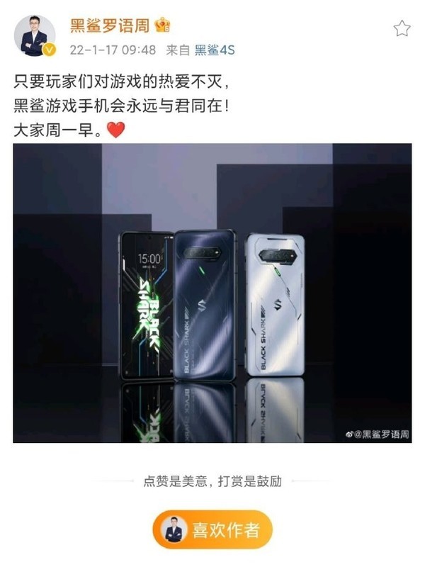 此前,有消息称腾讯拟收购黑鲨,收购后黑鲨的重点将从游戏整体转向VR设备。对此很多网友担心是否还能见到新一代黑鲨5系列。罗语周此前发的微博算是回应了大家的担忧,只要大家需要,黑鲨游戏手机就会有。
