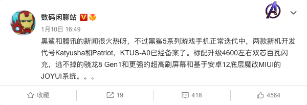根据爆料,黑鲨5系列游戏手机处于正常迭代中,两款新机的开发代号分别为Katyusha和Patriot。其中一款代号为KTUS-A0的新机已经备案,标配4600mAh的双芯电池和百瓦闪充,将搭载全新一代骁龙8系移动平台,还有更强的超高刷屏幕和基于安卓12底层魔改的MIUI JOYUI系统。