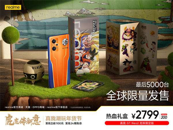 realme 真我 GT Neo2 龙珠定制版于 1 月 4 日发布,以悟空和龙珠世界为灵感来源打造,将龙珠中的人物形象、技能设定、经典元素等融入产品设计,配备 12GB 内存与 256GB 机身存储。
