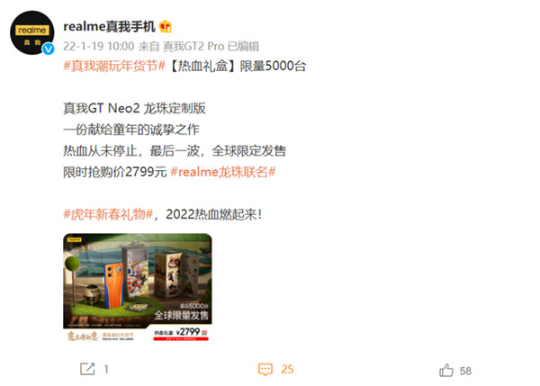 1 月 19 日消息,今日上午,realme 官方表示,真我 GT Neo2 龙珠定制版最后 5000 台全球限定发售,限时抢购价 2799 元。