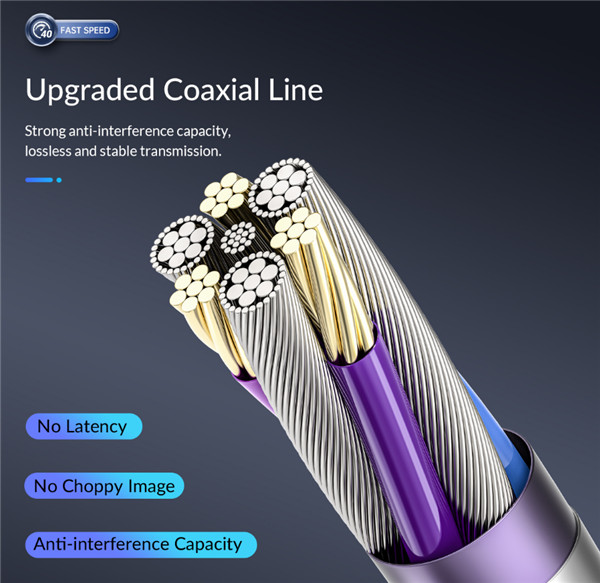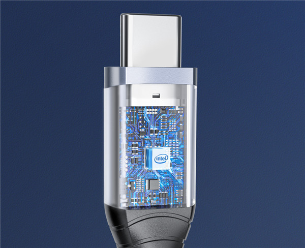 数据线的接口内置英特尔芯片,具有雷电 4 认证,同时向下兼容 USB 3.2、雷电 3 协议等。这款数据线的线芯采用多层屏蔽、绝缘设计,有着较强的抗干扰能力,保证数据高速传输。