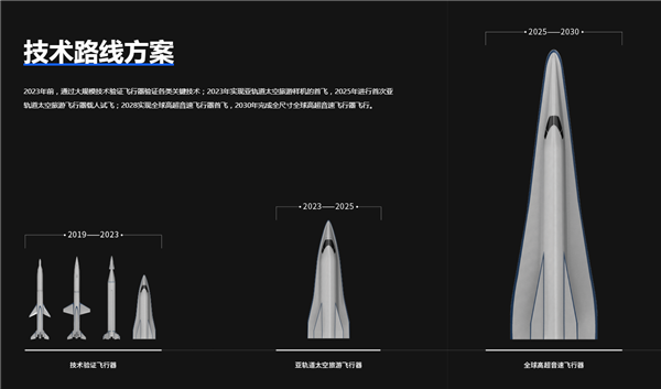 该公司透露,凌空天行计划在2023年前,完成大尺寸助推运载器地面试验,验证高速点对点运输的各类关键技术,️到2023年实现点对点高速运输助推运载器首飞,2024年完成运输飞行器的首飞,2030年前后完成高速载人飞行器样机的飞试。
