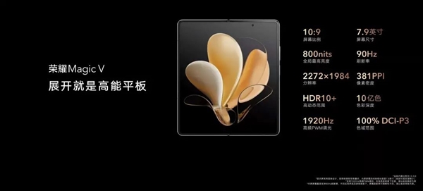 作为荣耀首款折叠旗舰,荣耀Magic V选用横向折叠屏的设计方案,内部主屏是一块7.9英寸屏幕,屏占比高达90%,支持90Hz刷新率、1920Hz高频PWM护眼,合上状态下,荣耀Magic V正面配备一块6.45英寸柔性OLED屏幕,支持120Hz刷新率,通过HDR10+认证。