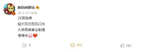 即将于2月发布的Redmi K50系列机型又有了新曝光,@数码闲聊站表示该机将采用2K高刷屏,支持超大双芯百瓦闪充,配备大底高像素主副摄。