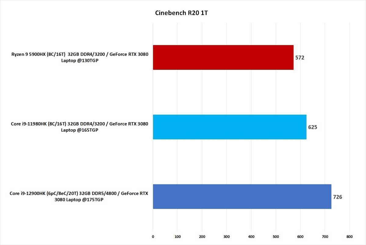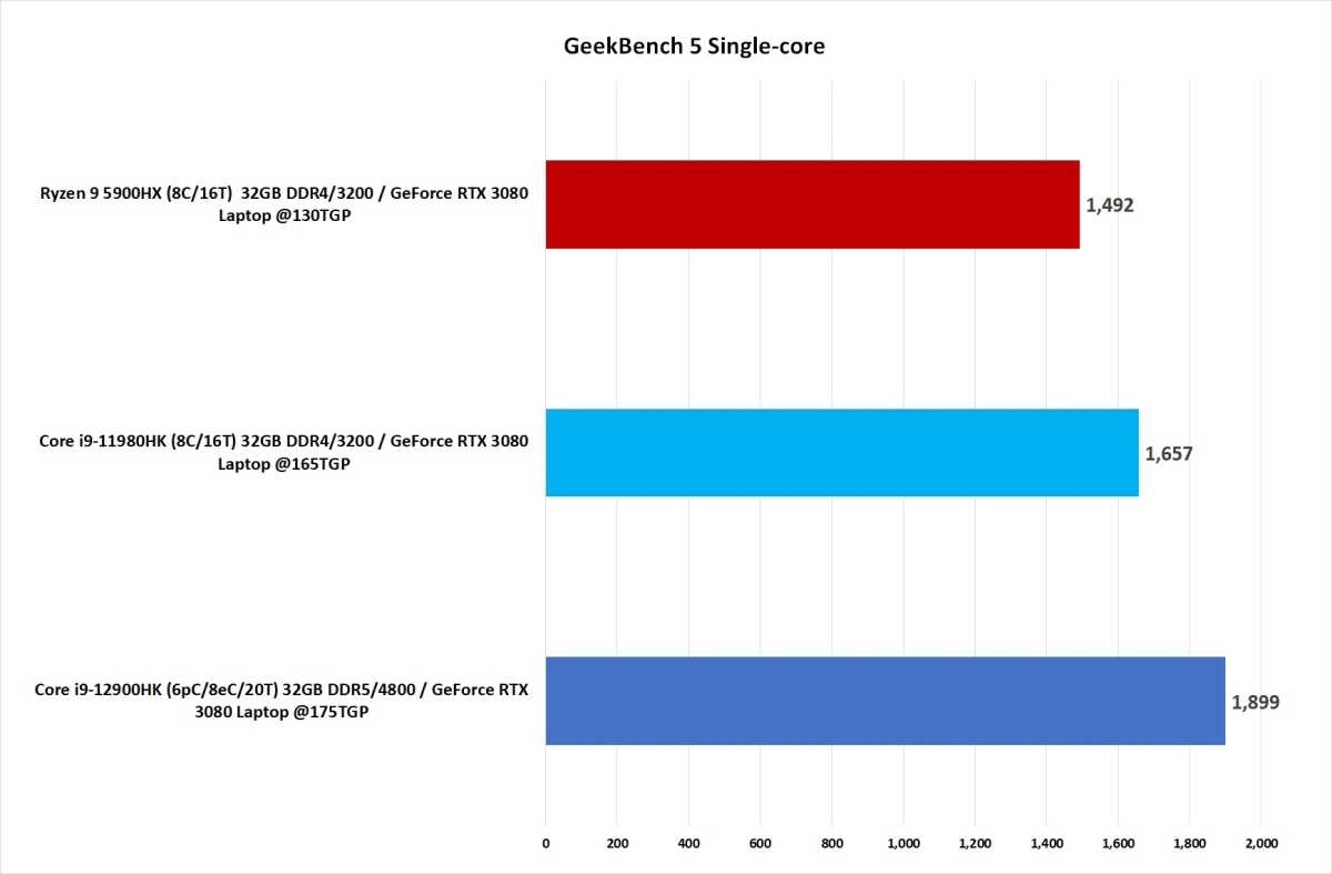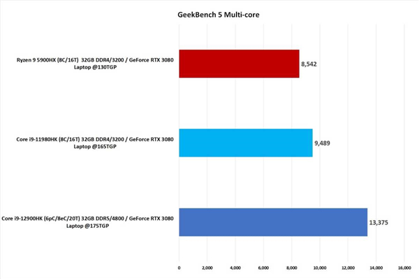 先看一组单核性能,i9-12900HK比上代提升了15-30%,比竞品也领先27-28%。