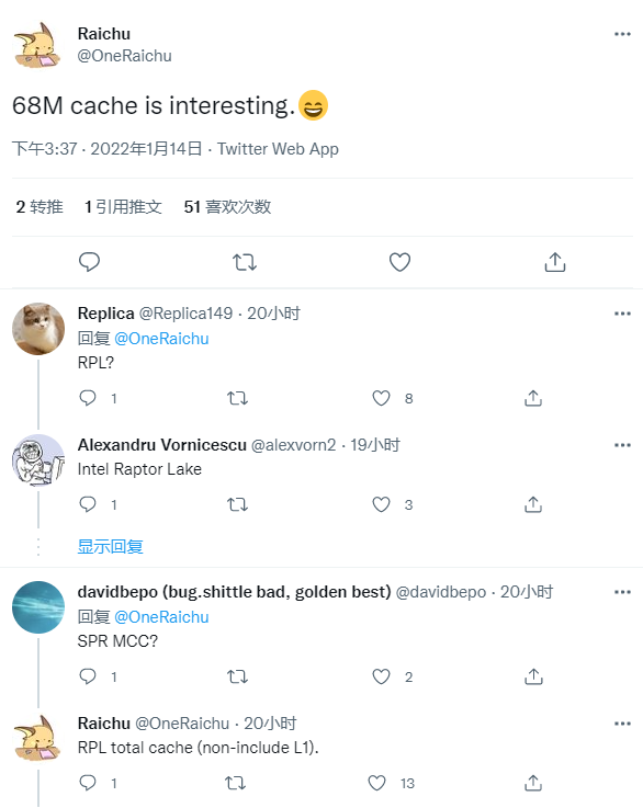 当前英特尔 12 代 Alder Lake CPU 具有 14MB L2 + 30MB L3 缓存(总 44MB)。若 13 代 Raptor Lake CPU 提升 55%(不含 L1 缓存),则 L2 + L3 缓存有望达到 68MB 。